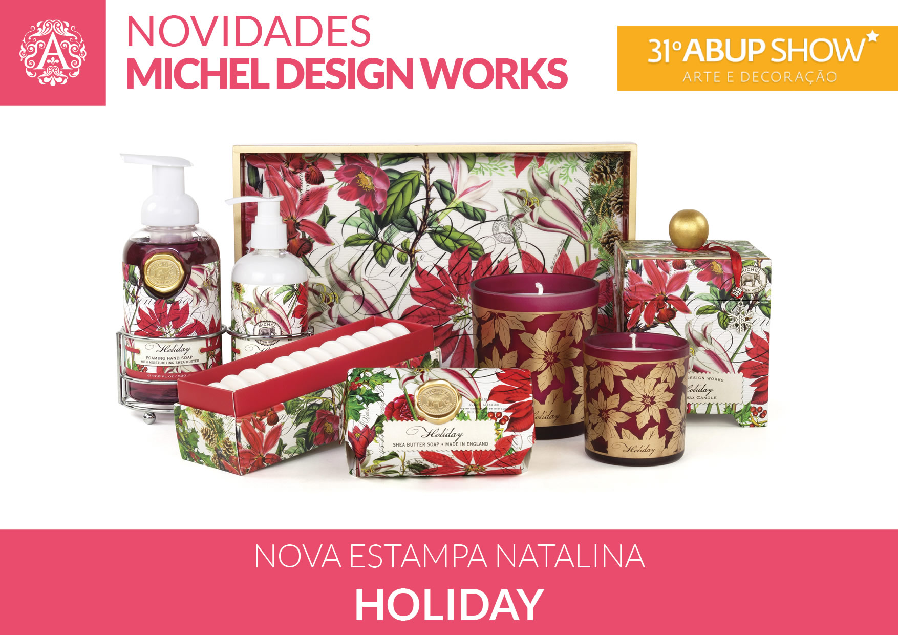 Além das novidades já apresentadas da marca Voluspa, a ANOVA TRADE irá trazer para o ABUP SHOW quatro novas estampas da marca Michel Design Works, sendo duas especiais de Natal. As coleções podem ser combinadas entre si e são perfeitas para montar kits para presentes e para decoração da sala, quarto ou lavabo. A linha de produtos é bastante diversificada, com itens de decoração e papelaria, além dos cosméticos, que compõem lindos kits com as toalhinhas de lavabo, velas e bandejas em tamanhos variados.
