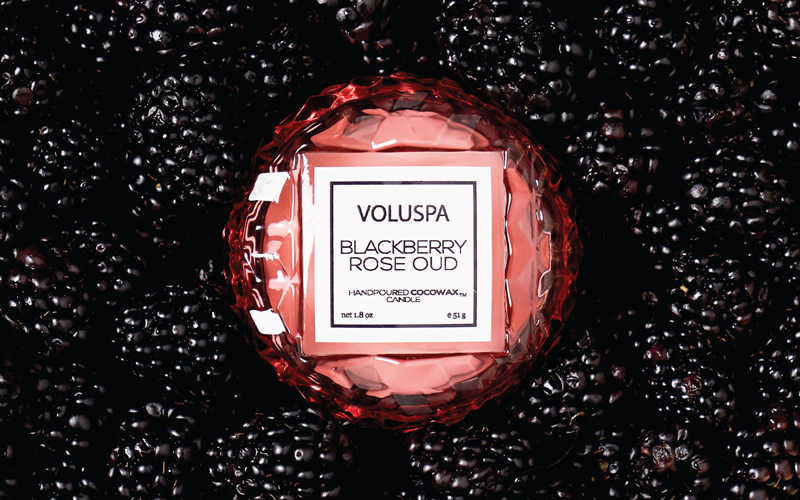 Está chegando ao Brasil a nova fragrância da marca americana de velas Voluspa, Blackberry Rose Oud.