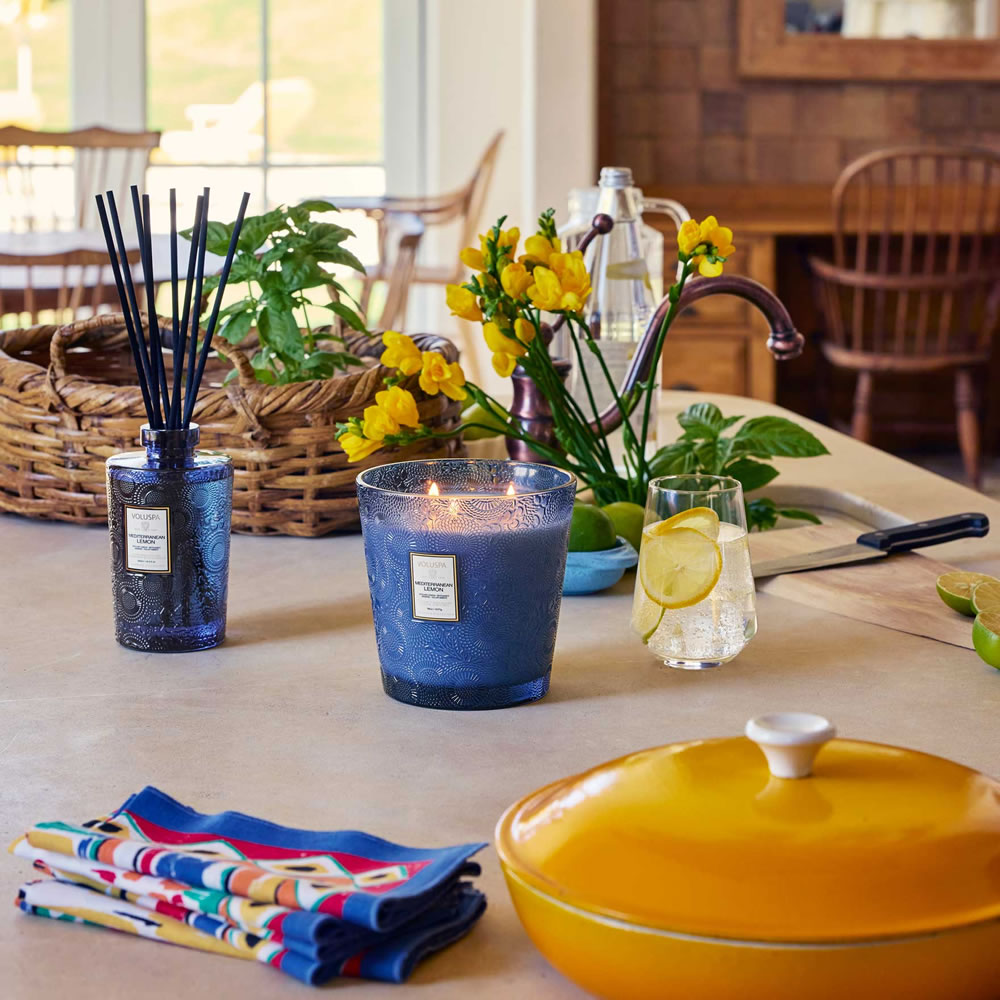 Mediterranean Lemon é apresentada em uma embalagem deslumbrante, em azul celeste com detalhes florais em estilo mosaico, uma homenagem à icônica Coleção Japonica da Voluspa. Cada peça é um verdadeiro item de decoração, elevando qualquer espaço.