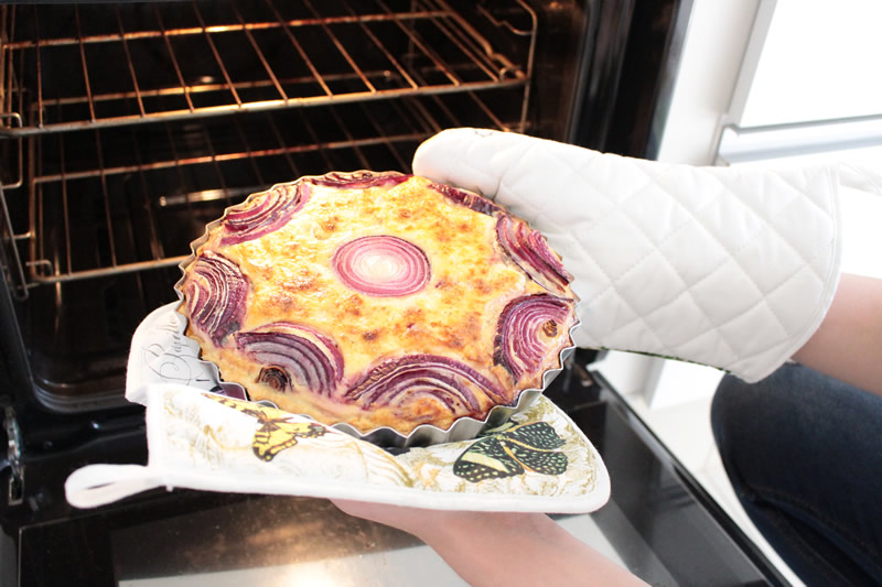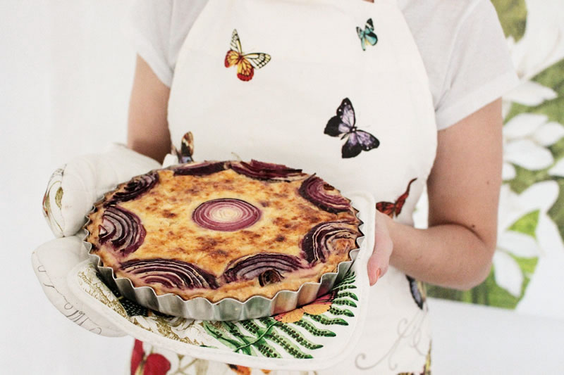 E o mais bacana é a variedade dos produtos que vão desde o avental que usei para o preparo completo da receita até os pratos e guardanapos que usei para servir! Aproveitei uma reunião de amigos para tirar a minha quiche de cebola roxa do forno em grande estilo com a luva e o pega prato quente, ainda usando o meu avental e finalizando o serviço com uma mesa colorida e alegre!