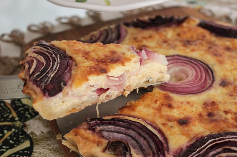 Como disse, a quiche pode ser feita de praticamente qualquer ingrediente que imaginar e dessa vez eu escolhi um que adoro, a cebola roxa.