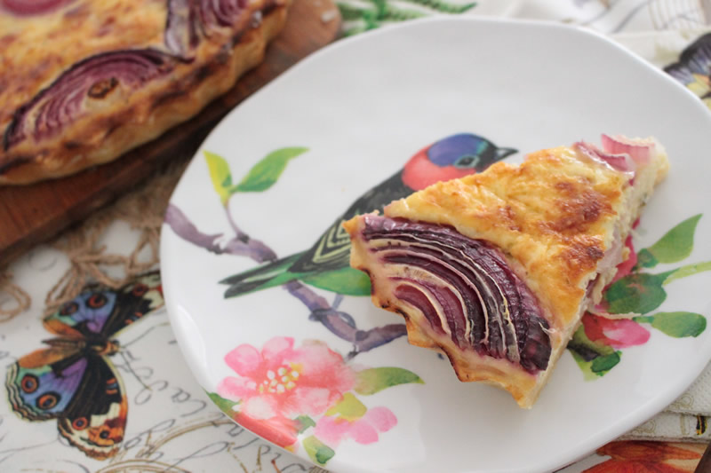 E é justamente por ser bem mais doce e conter bem menos ácido que escolhi a cebola roxa para o preparo da quiche de hoje. O resultado final ficou incrível e para deixar minha preparação ainda mais bonita, usei minha coleção Papillon da Michel Design Works para o serviço completo do prato!