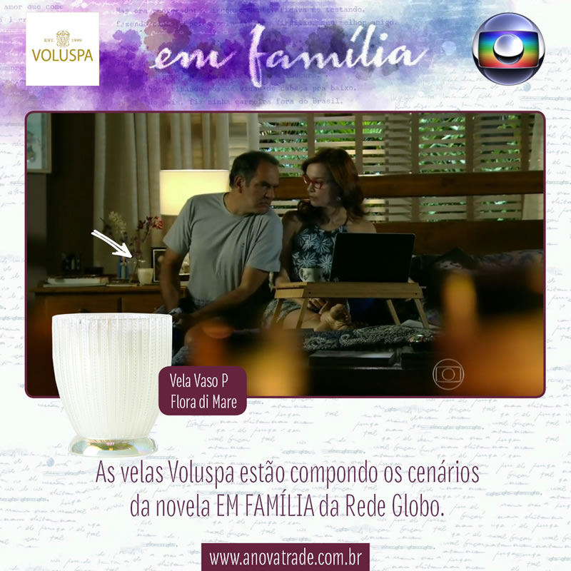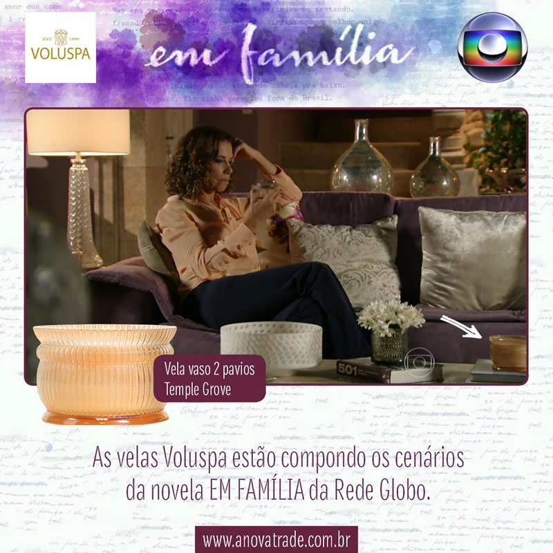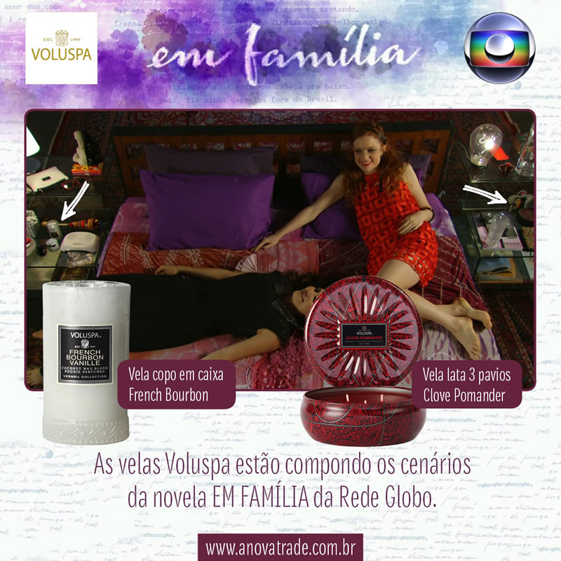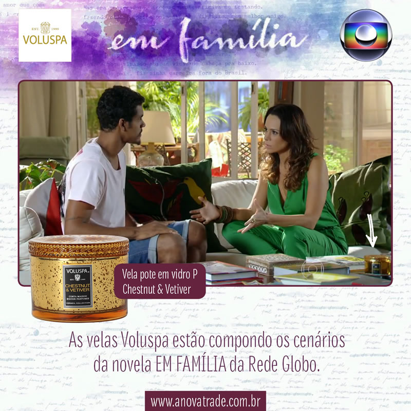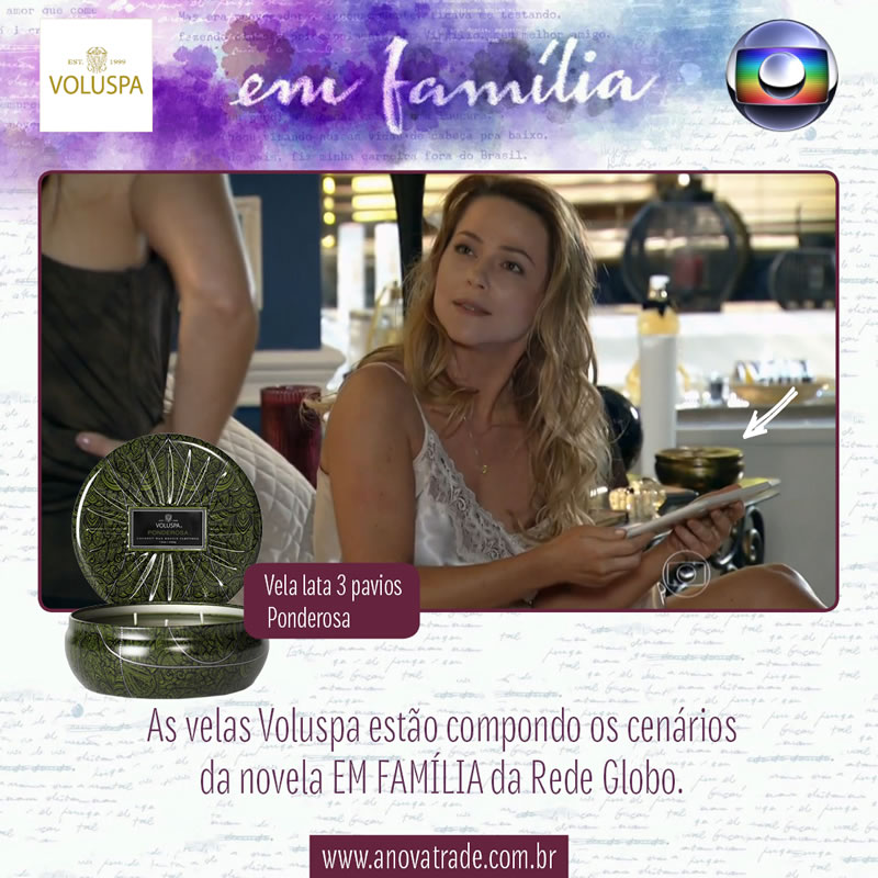 As velas da Voluspa, importadas e distribuídas com exclusividade pela Anova Trade no Brasil, estão sendo usadas novamente nos cenários da novela da Rede Globo, agora na novela Em Familía as 21hrs.
