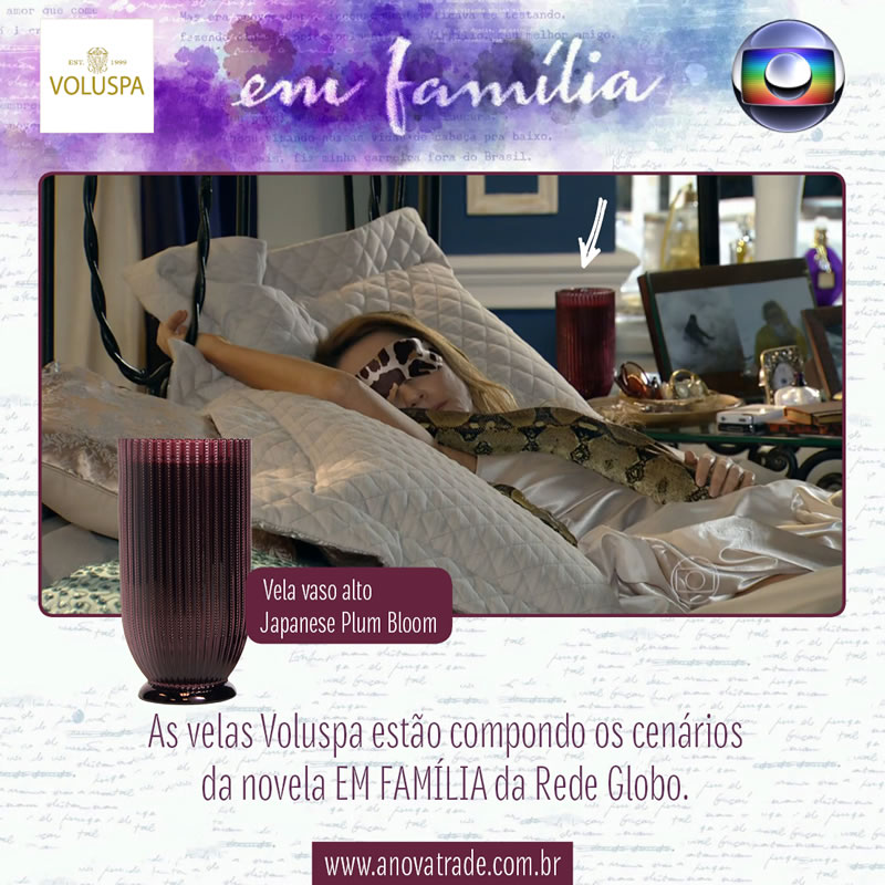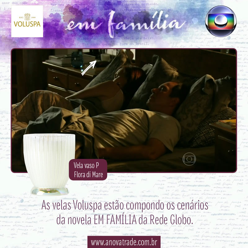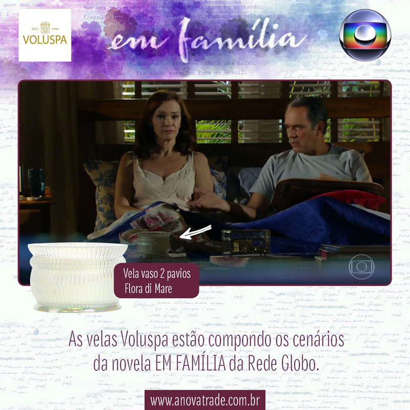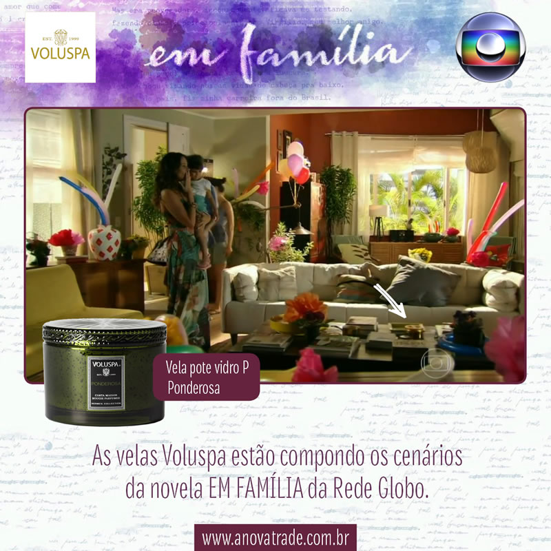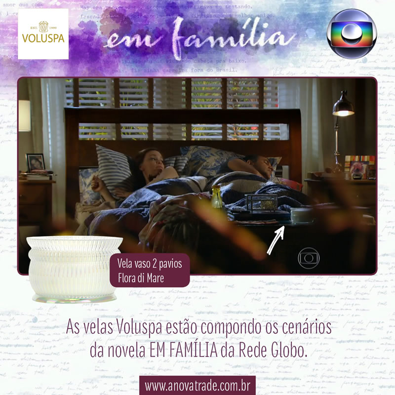 As velas da Voluspa, importadas e distribuídas com exclusividade pela Anova Trade no Brasil, estão sendo usadas novamente nos cenários da novela da Rede Globo, agora na novela Em Familía as 21hrs.