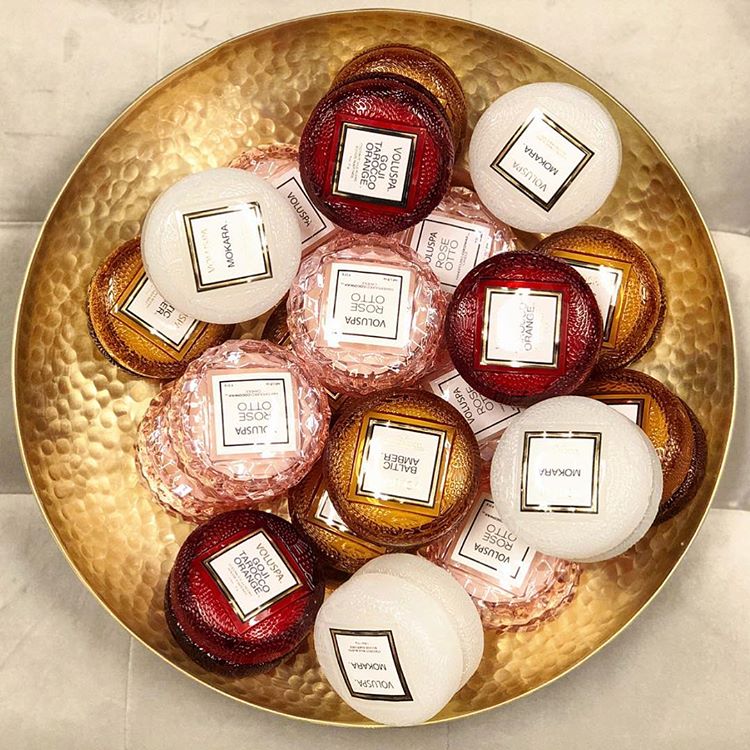 Além das novas fragrâncias, a Voluspa lança um novo kit de mini vela pedestal para presente em tons frios, com as velas nas fragrâncias Mokara, Moso Bamboo, White Currants & Alpine Lace e French Cade Lavender.