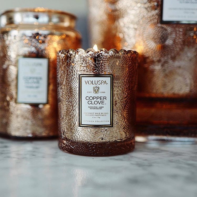 A fragrância Copper Clove traz lindas embalagens espelhadas e em tons de cobre, cor que está super em alta na decoração, e uma fragrância picante de cravo-da-índia, âmbar e abóbora.